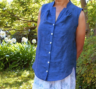 This is a shirt from Vogue Patterns V1387. I made this hipster plaid shirt not too long ago using the same pattern. I kept seeing all these sleeveless shirts in the stores and decided I should make one. I figured this pattern could be easily adapted to be a sleeveless shirt. Plus, I had this leftover silk/linen fabric that would be perfect for it. The fabric is great -- it is really lightweight but crisp and has a slight sheen to it. The crispiness does make the front pleats bubble out a bit, but I'm good with that. The shirt will probably soften after a few washings.